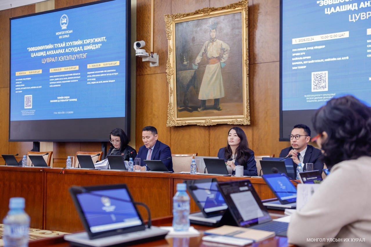 Ийнхүү Улсын Их Хурлын Эдийн засгийн байнгын хороо, Зөвшөөрлийн тухай хуульд нэмэлт, өөрчлөлт оруулах тухай хуулийн төсөл болон хамт өргөн мэдүүлсэн бусад хуулийн төслийг хэлэлцүүлэгт бэлтгэх үүрэг бүхий ажлын хэсгээс 2026 оны 02 дугаар сарын 24, 25, 26-ны өдөр зохион байгуулсан “Зөвшөөрлийн тухай хуулийн хэрэгжилт, цаашид анхаарах асуудал, шийдэл” сэдэвт цуврал хэлэлцүүлгээр байгаль орчин, барилга, хот байгуулалт, зам тээвэр, уул уурхай, хүнд үйлдвэр, эрчим хүч, боловсрол, харилцаа холбоо, банк санхүү зэрэг 16 салбарын зөвшөөрлийн талаарх танилцуулга мэдээллийг холбогдох яам, агентлагуудаас хийж,