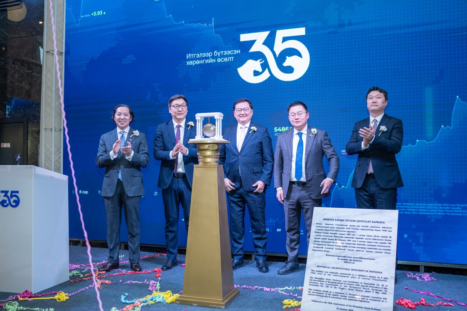 Монгол Улсад үнэт цаасны зах зээл үүсэж, “Монголын хөрөнгийн бирж” ХК байгуулагдсаны түүхт 35 жилийн ойн хүндэтгэлийн арга хэмжээ, арилжааг нээх цан цохих ёслол МХБ-ийн “MSE hall”-д зохион байгуулагдлаа.